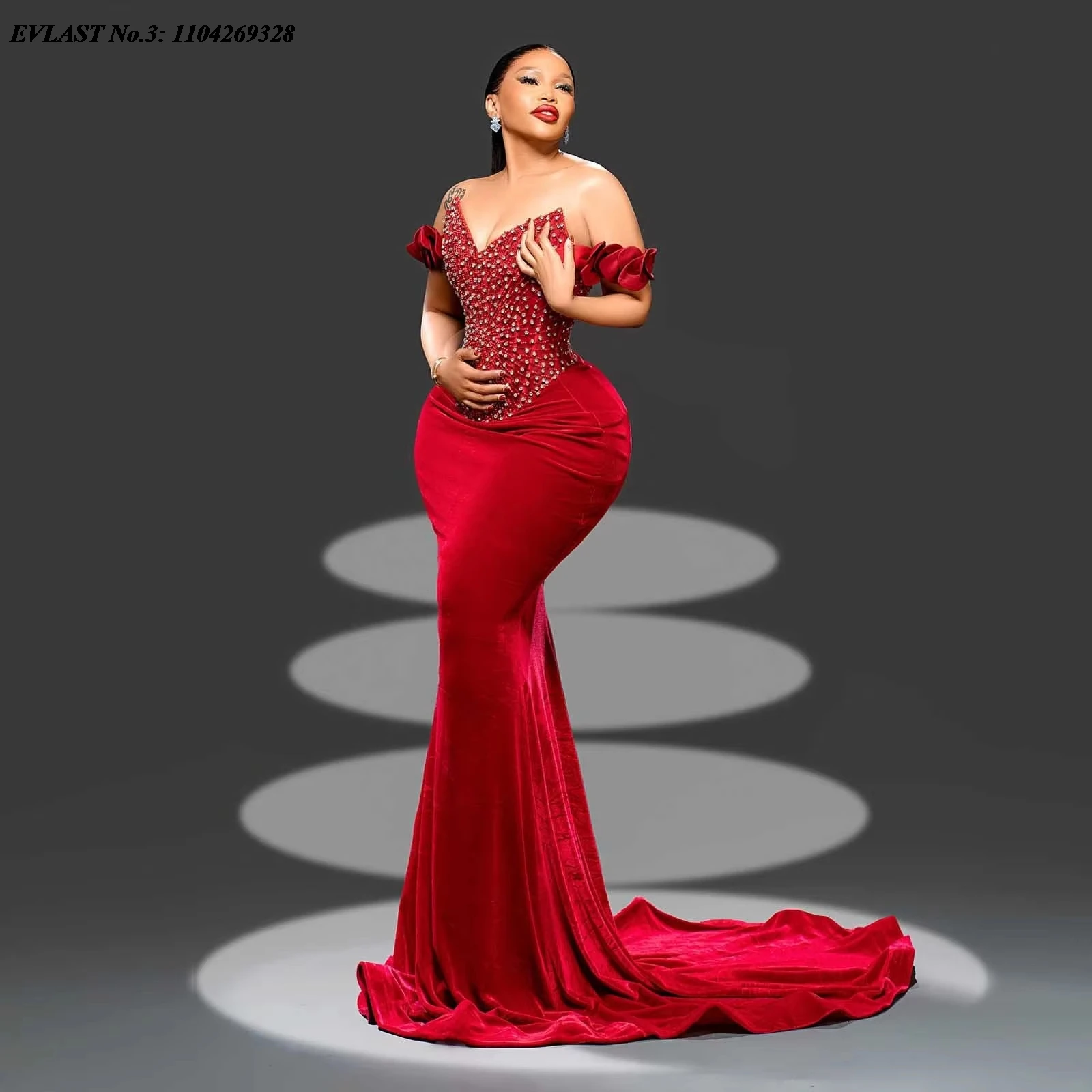 EVLAST Customized Elegance Red Velvet Evening Dress Rhinestones African Wedding Reception Aso Ebi Women Birthday Dress E3P352