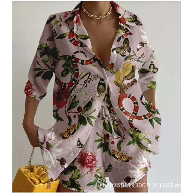Summer Vacation Print Casual Two-piece Set Women Spring Lapel Shirt&Shorts Outfit Female 3/4 Sleeve Loose Suit Women's Clothing