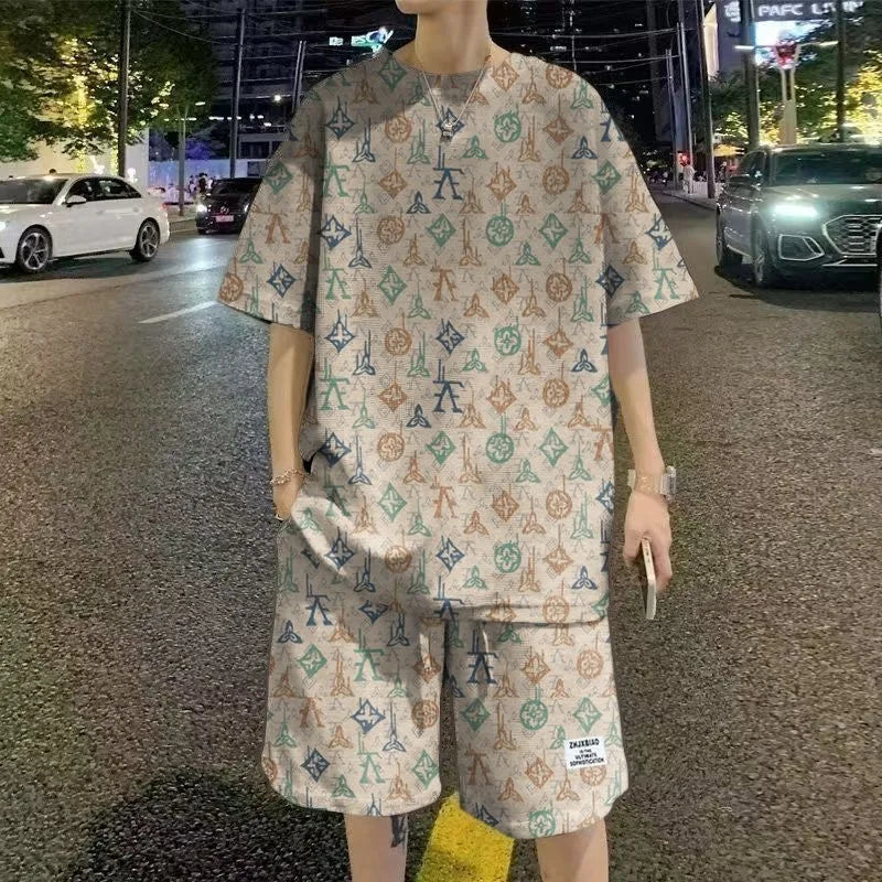 Summer New Fashion Trend Printed Short Sleeve T-shirt Sports Suit Men Loose Comfortable Breathable Plus Size Two-Piece Set 4XL